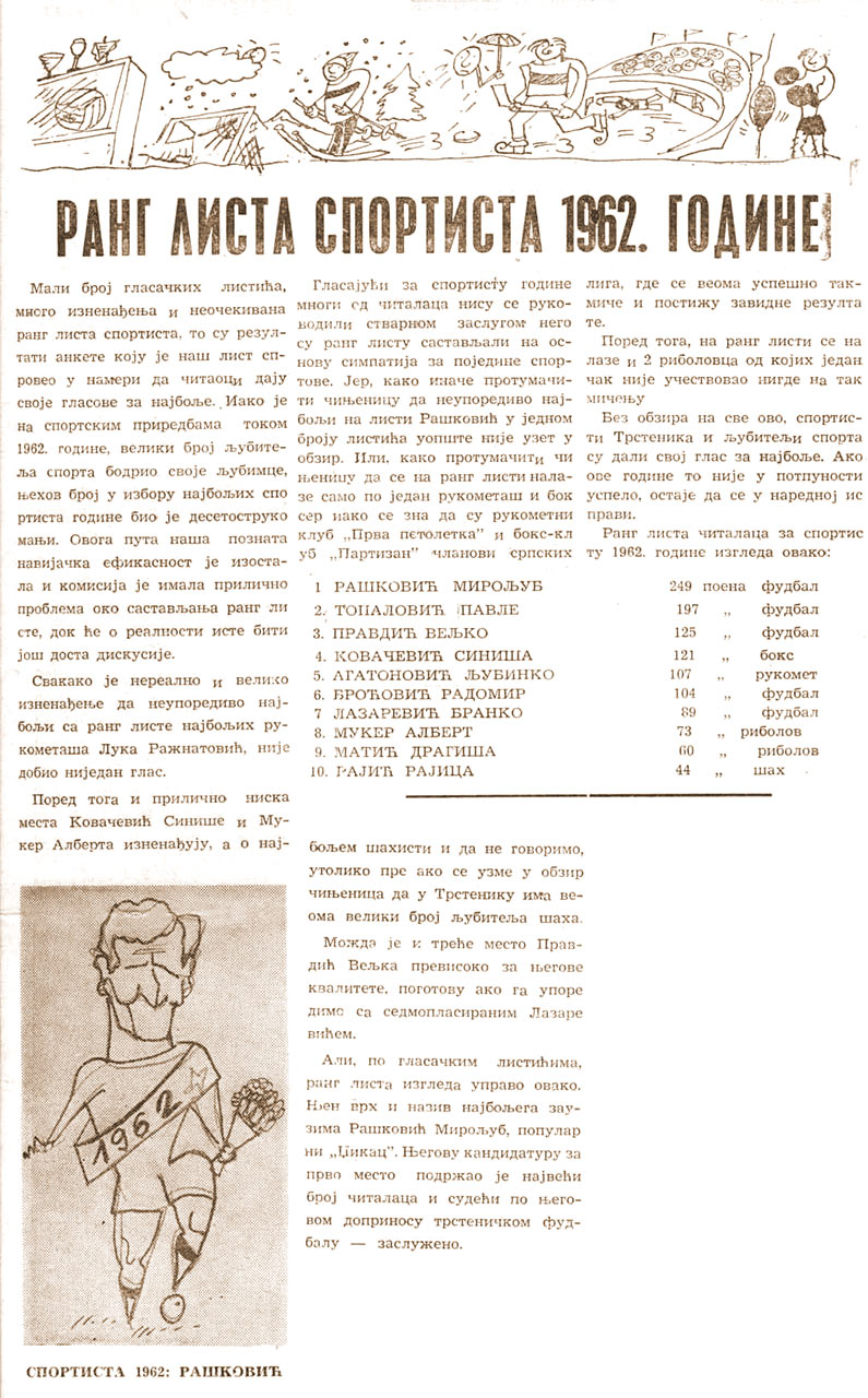 Остваривши добре резултате и улазак у Српску лигу, популарни Џикац је изабран за најбољег спортисту Трстеника за 1962. годину. У тадашњим новинама „Информације“  и „Трибина“, са преко 240 гласова је далеко намашио остале спортисте. Наравно прва три места на ранг листи најбољих су заузели фудбалери Трстеника, што многима, па и новинарима није било драго у то време. Али, као и данас, фудбал има далеко највећи број пратилаца и обожавалаца, па су гласања и најреалнија, свидело се то нама или не.