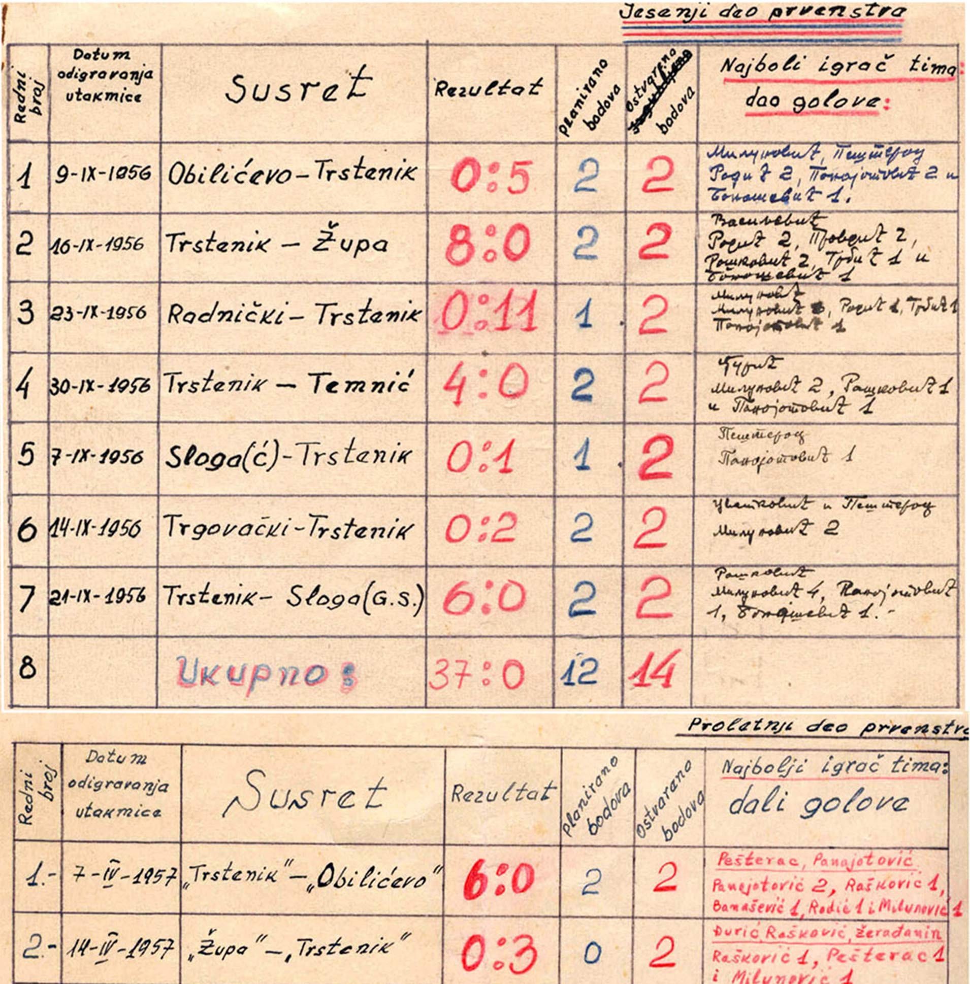 Једна од најбољих екипа ФК Трстеник, која је поставила и рекорд над рекордима: за 9 првенствених кола имала је гол разлику 46:0 у сезони 1956/57.